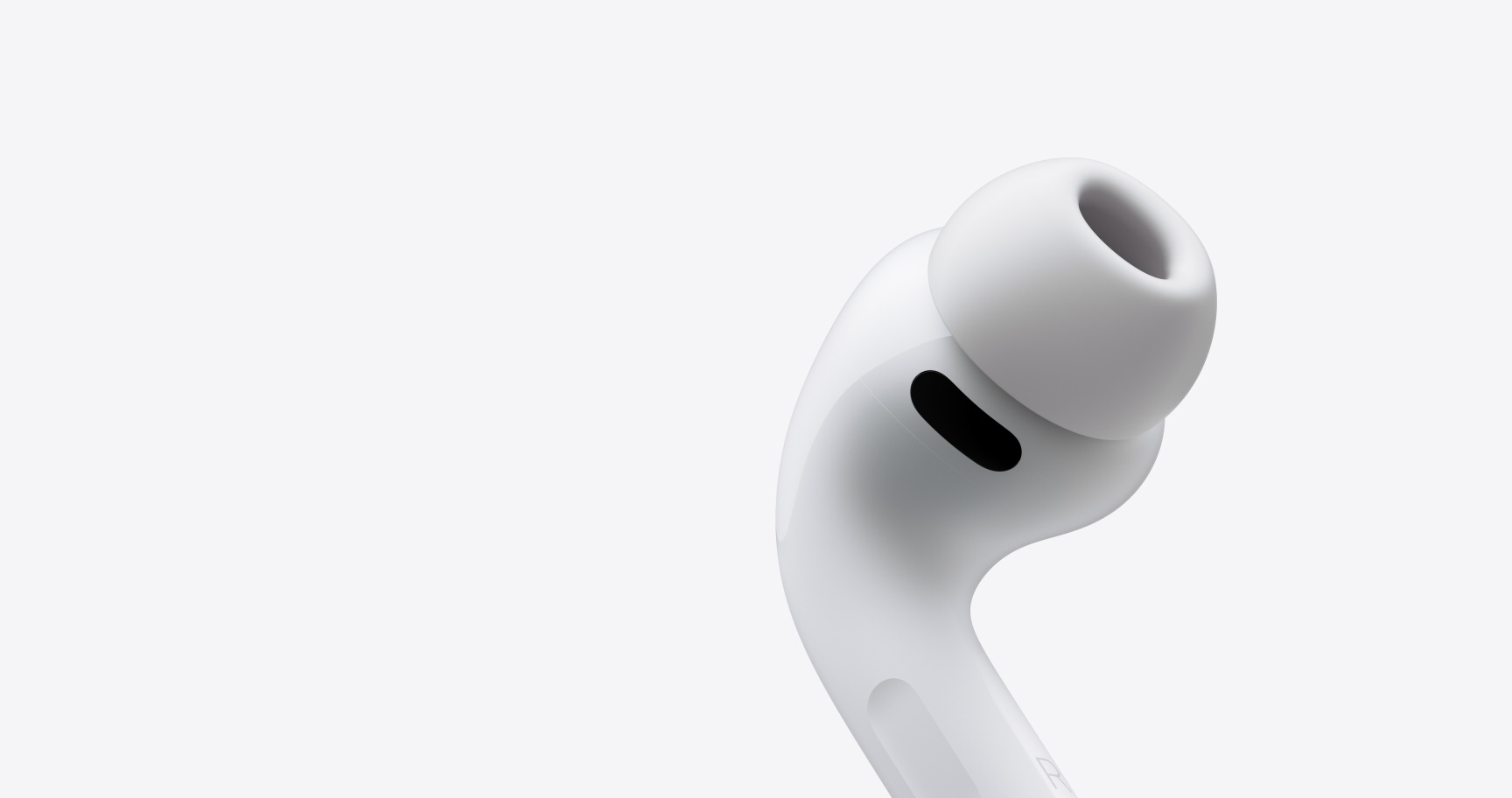AirPods Pro 3, white color, noise-cancelling microphone, silicone tip, short stem features letter R
