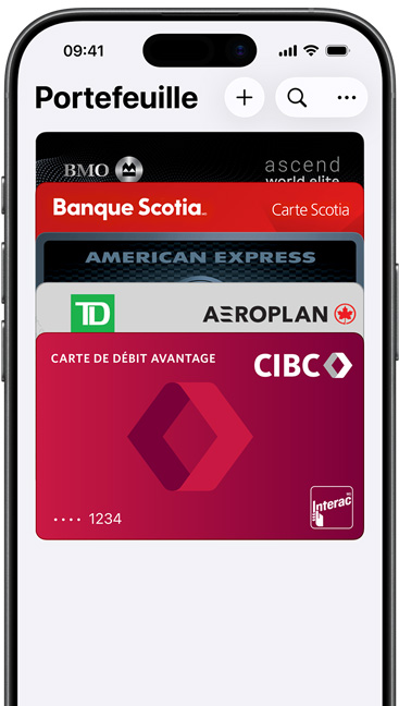Si vous avez déjà ajouté une carte de crédit, carte de débit ou carte de fidélité compatible avec Apple Pay dans Portefeuille, double-cliquez sur le bouton principal pour ouvrir l’app, puis approchez votre appareil du lecteur. Sur