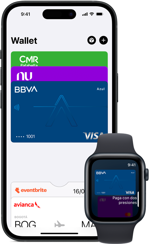 • Apple Pay funciona con las principales tarjetas de débito y crédito emitidas por bancos de todo el mundo. Y la lista crece todos los días. Puedes ver todos los bancos que trabajan con Apple Pay aquí. Si tu tarjeta aún no es compatible con Apple Pay, ponte en contacto con tu banco para obtener más información.