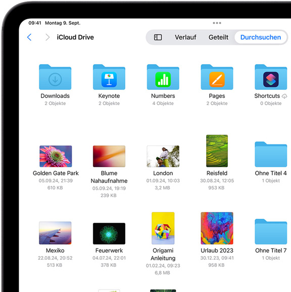 iCloud Drive sorgt dafür, dass die Dateien und Ordner, die du speicherst, leicht zu finden und zu teilen sind, egal welches Gerät du nutzt. Greif auf alles über die Dateien App in iOS und iPadOS, den Finder auf deinem Mac, den Datei Explorer für Windows PCs oder iCloud.com zu.