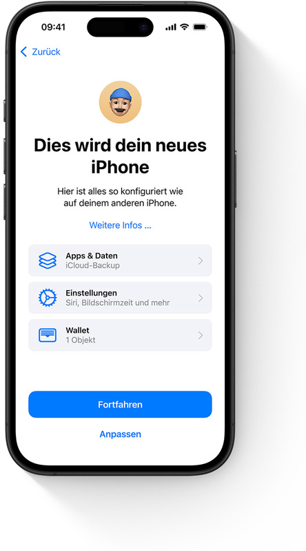 Stelle dein Gerät wieder her oder richte ein neues mit deinem iCloud Backup ein, um alle deine Fotos, Dateien, Kontakte, Apps, Ein­stellungen und mehr nahtlos zu übertragen, damit es sich genauso anfühlt und aussieht wie das vorherige Gerät.