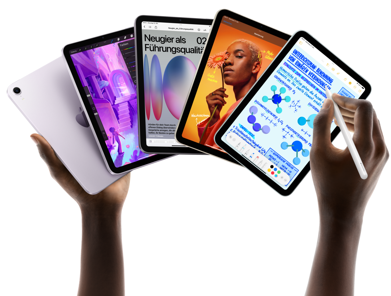 Fünf iPad mini Modelle werden in einer Fächerformation in den Händen gehalten. Ein Modell zeigt die Rückkamera, die anderen vier sind von vorne zu sehen. Mit dem Apple Pencil Pro werden Notizen gemacht.
