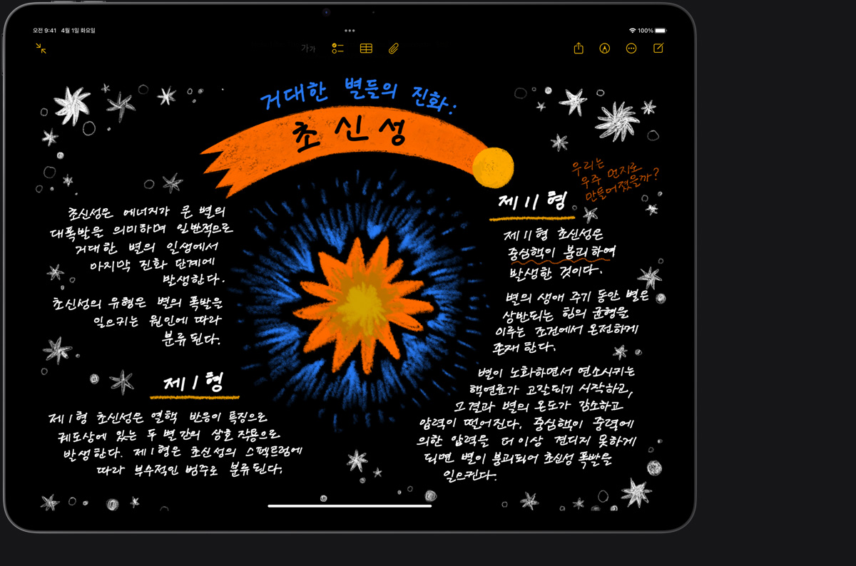 Apple Pencil은 그림을 그리고, 손글씨를 쓰고, 필기를 하는 행위가 어떤 느낌으로 이루어져야 하는지에 대한 기준을 제시합니다. 직관적이고, 정밀하면서도 사뭇 신기롭죠. 픽셀 단위의 정밀함에 극히 짧은 지연 시간, 기울기 감지 기능, 팜리젝션 기능까지 갖췄답니다. Apple Pencil Pro는 여기에 더욱더 많은 기능을 더해 전에 없던 방식으로 당신의 아이디어에 생명을 불어넣을 수 있게 해줍니다.2