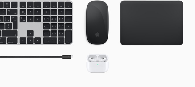 اكسسوارات Magic لاسلكية، قابلة لإعادة الشحن، دقيقة ومريحة. وتأتي الآن بخيار اللونين الفضي والأسود لتكمّل شاشة Studio Display وتكتمل بها روعة الاستوديو.