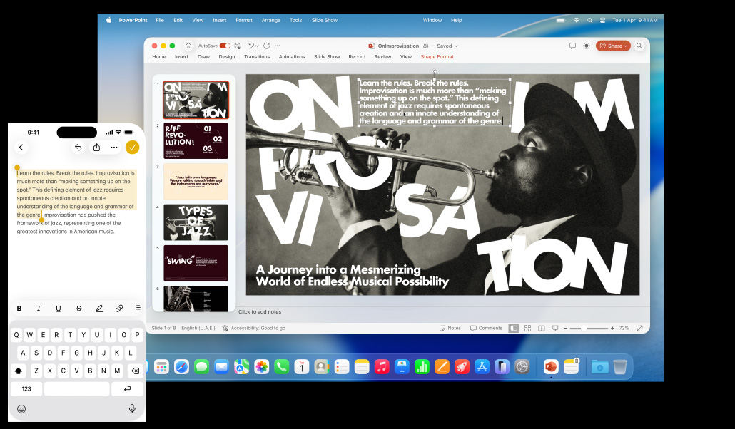 Say you start writing an email on your iPhone, but you want to finish it on your Mac. Or you start writing a report on your iMac, but want to continue on your iPad as you head to your meeting. Handoff makes it possible — and totally seamless. When your Mac and your iPhone or iPad are near each other, they can automatically pass what you’re doing from one device to another.4 An icon representing the last app you were using will appear on your second device — in the Dock on your Mac or iPad or in the App Switcher on your iPhone. Just click or tap to pick up right where you left off without having to search for the file. Handoff works widely across the system and can even work with third‑party apps.