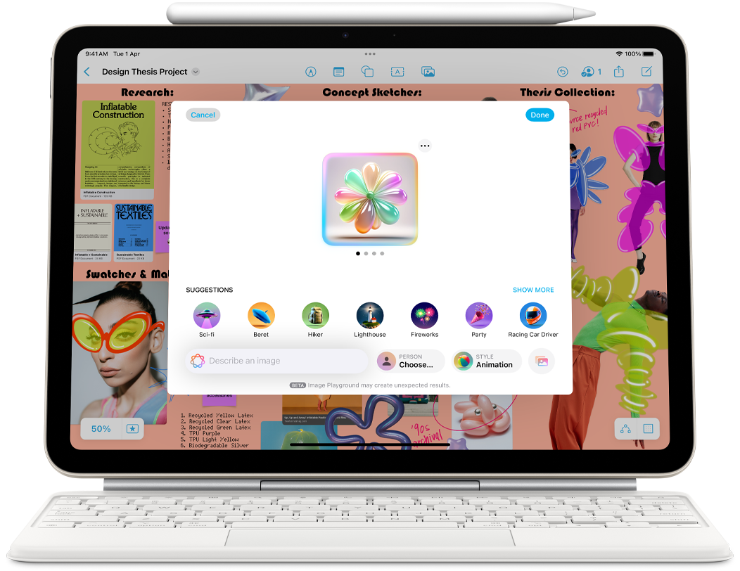 Landscape view of iPad Air showcasing Apple Intelligence with Image Playground and Keynote, Apple Pencil Pro