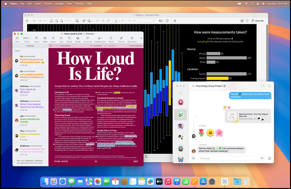 Group apps together for each class and quickly switch between projects with Stage Manager. Or use window tiling to effortlessly arrange windows into side‑by‑side tiles on your desktop.